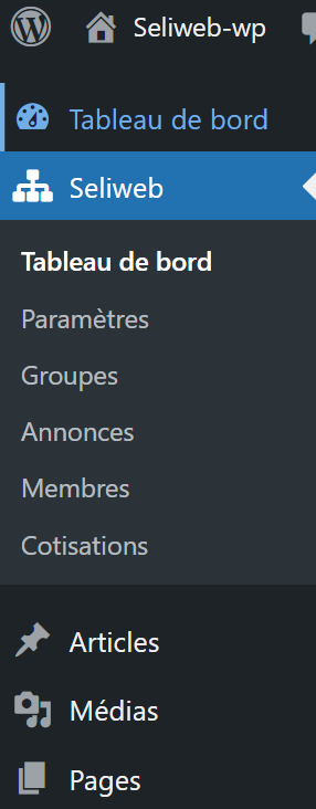 Voici un aperçu du back-office. on y voit le menu Seliweb et les sous-menus.